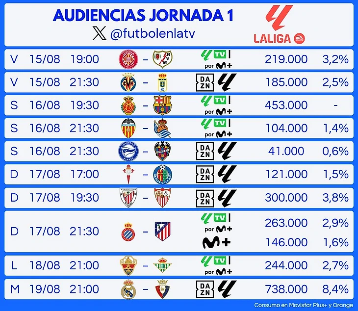 Телевизионные рейтинги LaLiga: топ и аутсайдеры 1-го тура