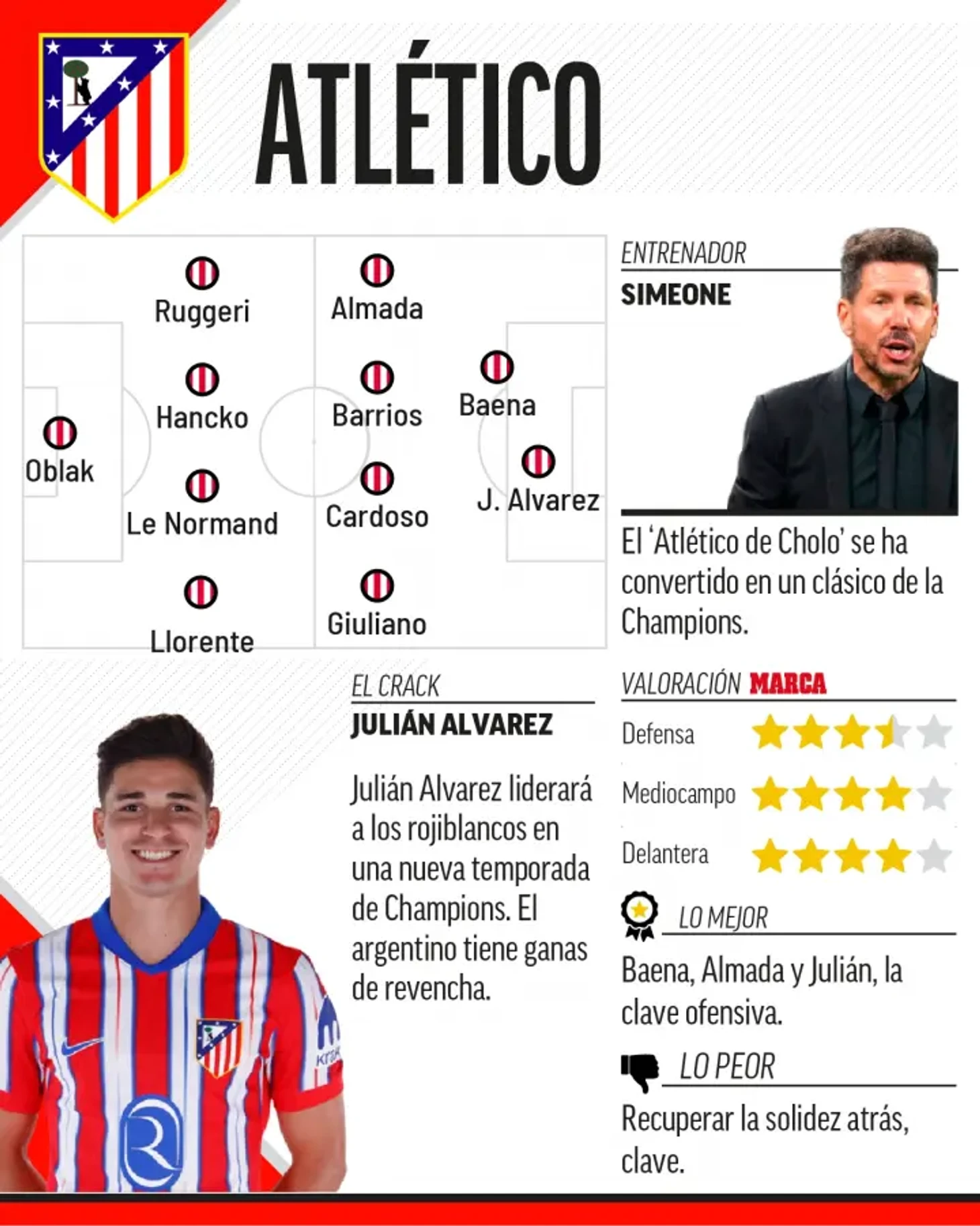 «Атлетико» намереваясь вновь сразиться с лучшими командами континента. Команда Симеоне блистала в прошлом розыгрыше, одержав такие памятные победы, как победа в Париже и триумф над «Байером», где команда практически весь матч была в меньшинстве. Много лет уверенно играет в главном континентальном турнире и дважды выходя в финал, «красно-белые» стремятся преодолеть барьер четвертьфинала, который ускользал от них в последние сезоны.