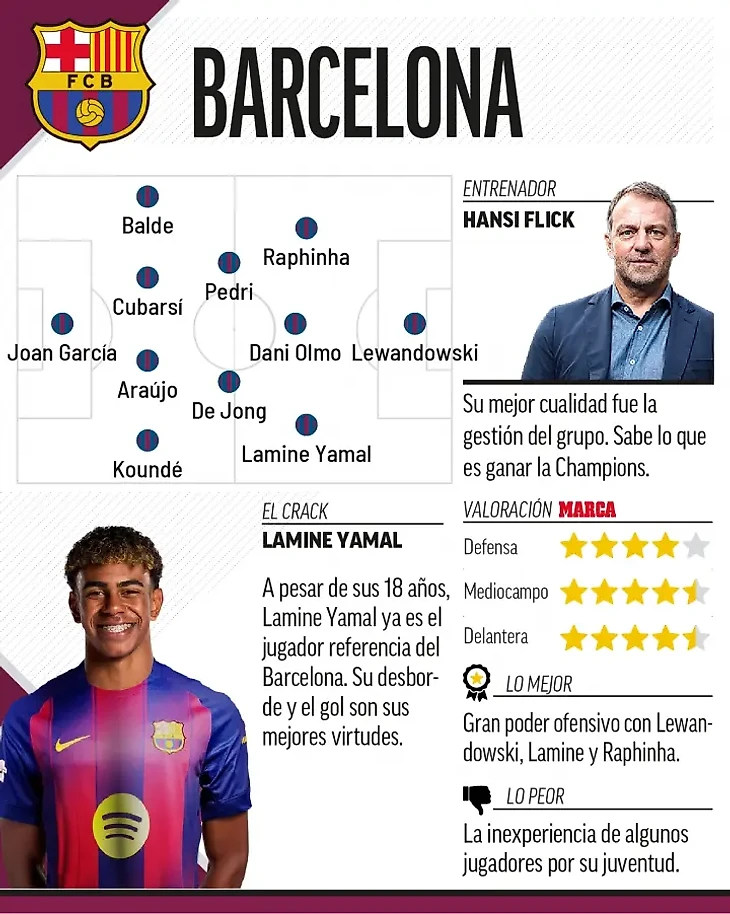 «Барселона» сохранила тот же состав, что и в прошлом сезоне, когда клуб вышел в полуфинал Лиги Чемпионов. Наиболее важным усилением стало усиление ворот с приходом Хоана Гарсии, который уже продемонстрировал свой класс в своих первых матчах. Маркус Рэшфорд усилил атаку, которой потребовалось больше игроков после ухода Ансу Фати и Пау Виктора. Британец хочет вернуть себе высокий уровень, достигнутый несколько лет назад. Самым важным уходом стал уход Иньиго Мартинеса, перешедшего в арабский футбол. Лига чемпионов — главная цель команды, и они считают себя способными её выиграть.