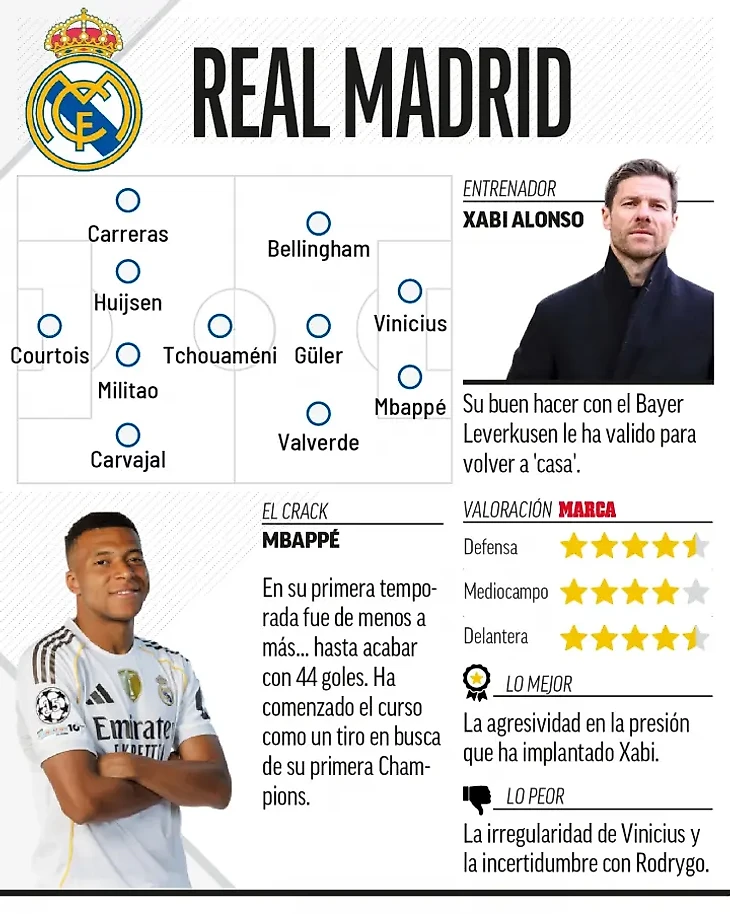 Приход Хаби Алонсо знаменует собой «смену цикла». Его влияние уже заметно, как и активная игра Каррераса на левом фланге и скачок уровня атаки команды благодаря передачам Хейсена. Тренту предстоит конкурировать с Карвахалем, а Мастантуоно ищет место для игры, ожидая возвращения Беллингема. Стоит отметить прогресс Тчуамени и Арды Гюлера, который взял под контроль полузащиту. Мбаппе закрепил за собой статус лидера благодаря голам, а Винисиус продолжает бороться за возвращение своей формы и внимательно смотрит на то как Хаби Алонсо объясняет ему как правильно нужно отдавать пас.