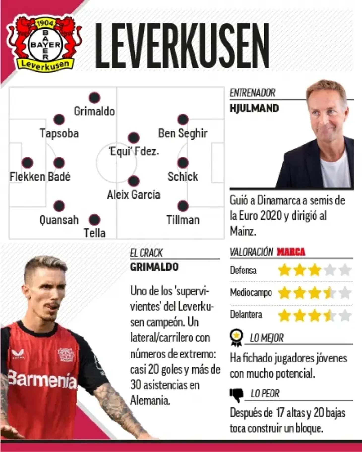 От команды, выигравшей Бундеслигу и Кубок с Хаби Алонсо в сезоне 2023/24, не осталось и следа. Этим летом ушли 20 игроков и пришли 17 игроков. «Байер» одновременно побил рекорд по расходам на трансферы 198 миллионов евро и доход от продаж 229 миллионов евро в истории Бундеслиги. Они даже успели уволить Тен Хага и посадить Каспера Юльманда на скамейку запасных. Заменить Вирца, Фримпонга, Джаку, Таха будет непросто, но они привлекли молодых игроков с большим потенциалом Тиллман, Куансах, Бен Сегир, Эчеверри, Поку, Маса... и опытного Лукаса Васкеса.