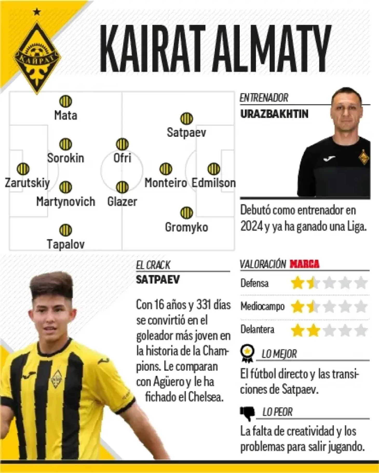 Дебютировав, «Кайрат» стал самой восточной командой в истории Лиги Чемпионов. Алматы находится в 6634 километрах от Мадрида и всего в 300 километрах от границы с Китаем. Чемпионы Казахстана заслужили своё место в турнире: в отборочных раундах они выбили «Олимпию» Любляну, КуПС, «Слован» и «Селтик», причём последние два — по пенальти. Не имея креатива, подопечные Рафаэля Уразбахтина постараются набраться сил за счёт низкой обороны. В атаке, помимо Сатпаева, стоит следить за навесами Громыко и неуловимым Жоржиньо.