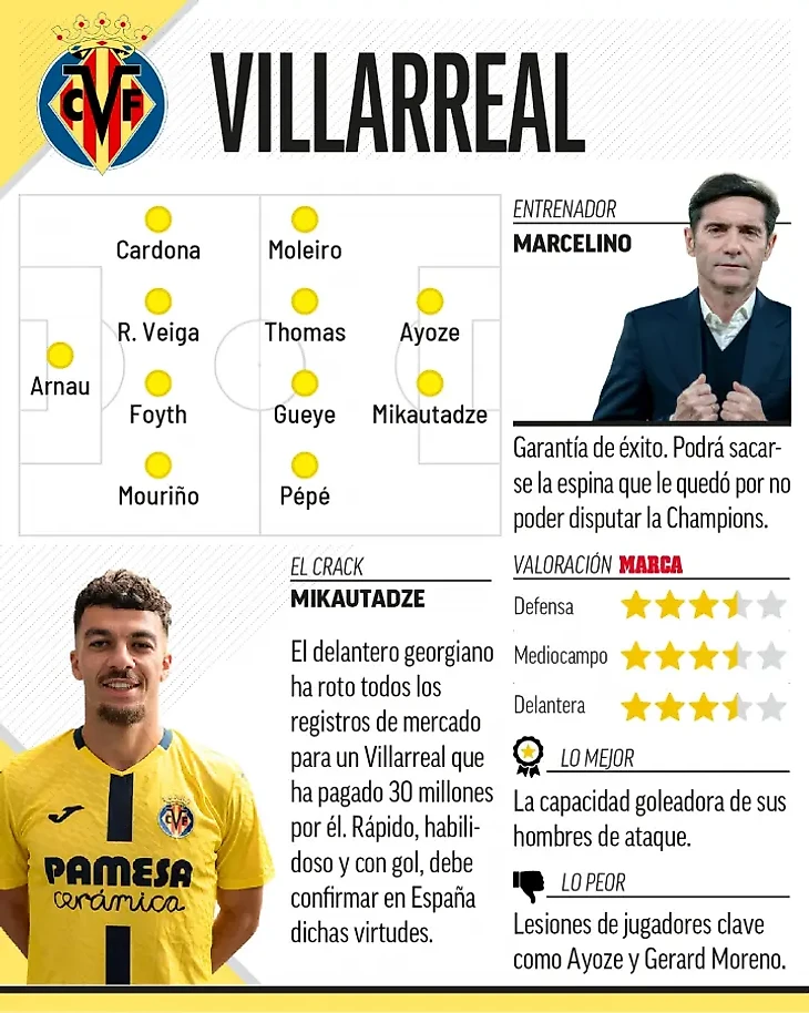 «Вильярреал» возвращается в Лигу Чемпионов четыре года спустя, оставив незабываемые воспоминания о полуфинале против «Ливерпуля» под руководством Унаи Эмери. Теперь, под руководством Марселино. Клуб понимает, что жеребьёвка сведёт их с командами топ-уровня, поэтому выход в плей-офф, цель, которую они перед собой поставили, будет нелёгкой. Мощная оборона и классные атакующие игроки Айозе и Микаутадзе — их главные козыри.