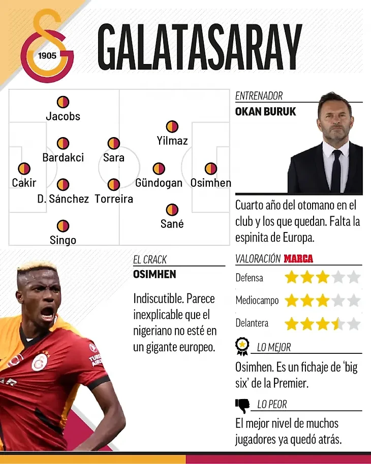 Чтобы наконец-то выступить достойно в Лиге Чемпионов, они подписали чемпиона Европы в лице «Гюндогана». Немец приезжает в клуб всей своей жизни в сопровождении соотечественника Лероя Сане. Что ещё важнее, их звездный игрок, Виктор Осимхен, теперь полностью в их распоряжении. В Турции «Галатасарай» уже возглавляют турнирную таблицу, сыграв «на ноль» (четыре из четырёх матчей). Сезон выглядит многообещающим. Пятый год под руководством Окана Бурука.