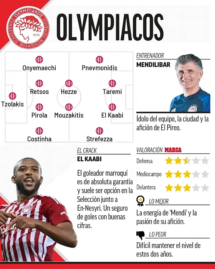 Чемпионы чемпионата и Кубка Греции надеются на очередное чудо от тренера басков Хосе Луиса Мендилибара. Менди уже герой так как возродив клуб благодаря победе в Лиге конференции 2023/2024. В этом году цель — сохранить этот уровень на местном уровне и постараться выступить достойно Лиги Чемпионов. «Олимпиакос» уже совершил несколько небольших приобретений, потратив, например, восемь миллионов на итало-бразильского Стрэфеццу. В стартовом составе у него также есть испанский игрок, например, опытный полузащитник Дани Гарсия.