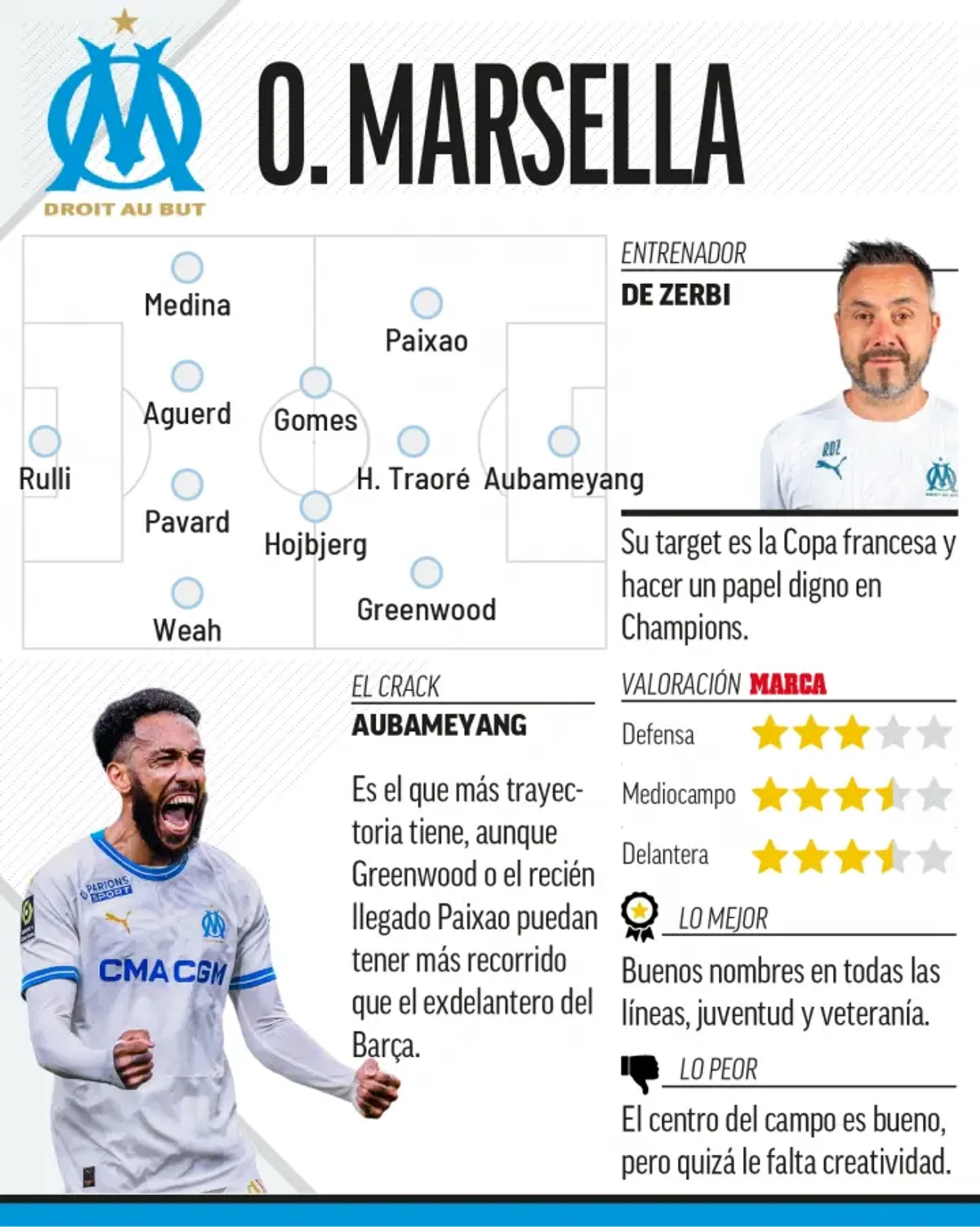 Роберто Де Зерби, как это принято в проблемном «Марселе», начал год с уже решённой проблемой Рабьо. Хотя победить «ПСЖ» практически невозможно, «Марсель» обязан блеснуть в этом сезоне, подписав, например, Обамеянга. У них есть хорошие игроки во всех линиях, хотя и не звёзды, и они без проблем займут второе место в Лиге 1 и постараются успешно сыграть в Лиги Чемпионов.
