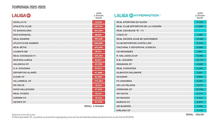 «Реал Мадрид», как обычно, является клубом с наибольшим бюджетом: его потолок зарплат составляет 761 миллион евро против 754 миллионов в прошлом сезоне. Тем временем «Барселона» сократила свои допустимые расходы до 351 миллиона по сравнению с 463 миллионами в прошлом зимнем трансферном окне. Это снижение на 112 миллионов евро. Как объяснил Хавьер Гомес, генеральный директор Ла Лиги, это связано с проблемой, с VIP-ложами на стадионе.
