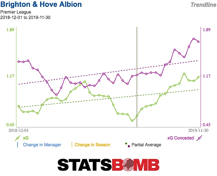 Как видно из графика ниже – Брайтон стал лучше в атаке, но при этом стал хуже в обороне, они все еще допускают гораздо больше, чем создают. У «шпор» четвертая атака, которая создает 1,5+ xG в среднем за матч, а у «чаек» 17-я оборона, которая допускает больше 1,5 xGA в среднем за матч.