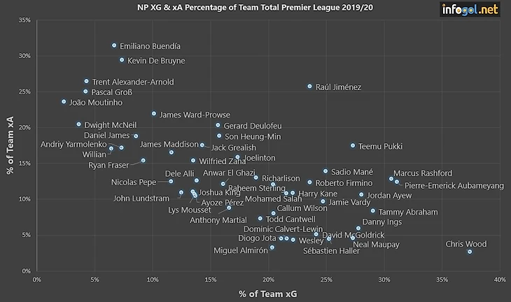*** На инфографике ниже виден вклад игроков в командные показатели xG и xA в %. Вертикальная ось – xA, горизонтальная – xG.