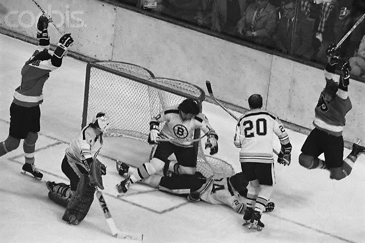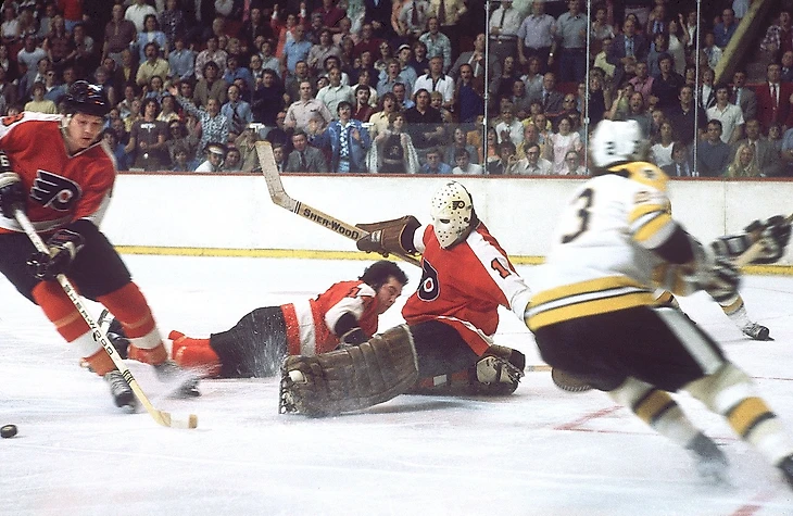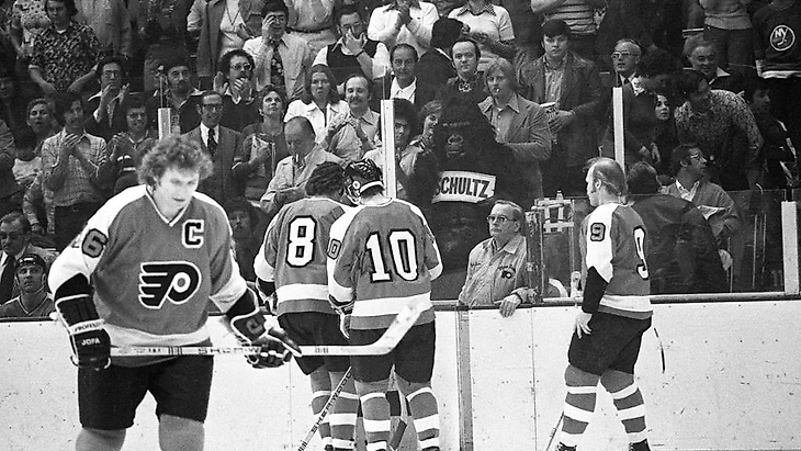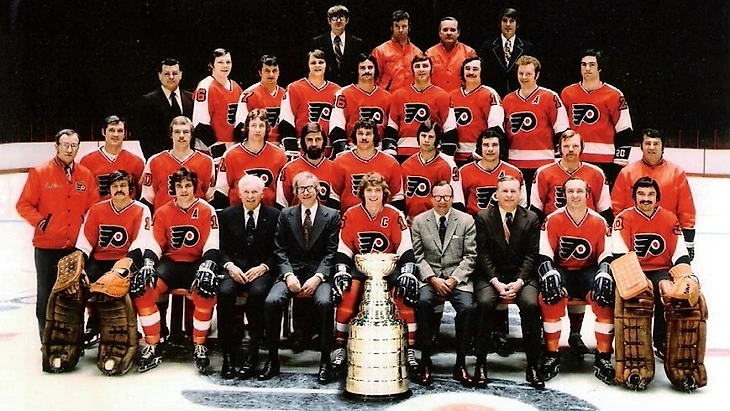 Легендарное фото с финала Кубка Стенли 1974 года, игроки Филадельфии в том году выиграли свой первый трофей.