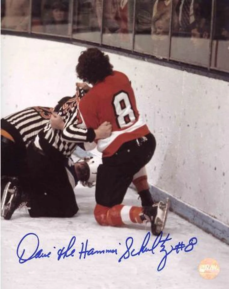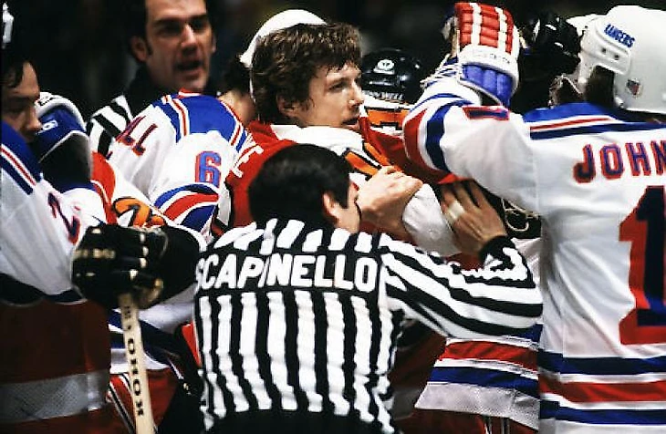 Заметьте, что у Шульца кулаки замотаны, как у боксера. Так вот, из-за Шульца,  НХЛ даже пришлось вводить новое правило, по которому игроку нельзя выходить на лед с боксерской перемоткой под крагами.