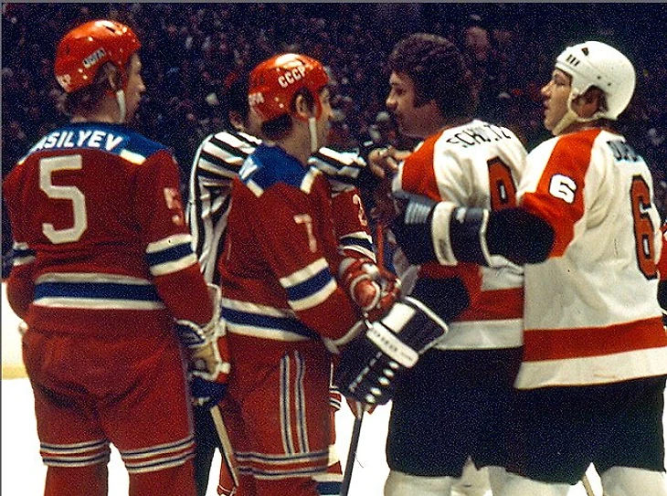 «Кувалда» Шульц и Андре «Лось» Дюпон, в легендарном матче Суперсерии-76 против ЦСКА, пытаются запугать Бориса Петровича Михайлова.