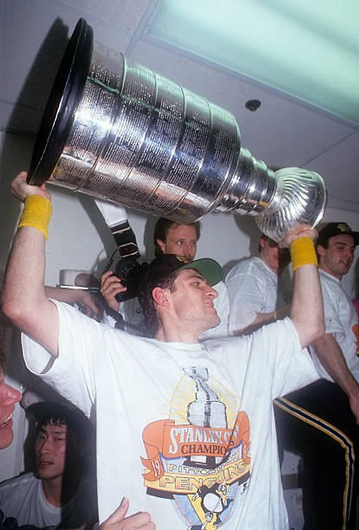 Рон Фрэнсис поднимает над головой Кубок Стэнли. В плей-офф-1991 Рон набрал 17 очков, в 24-х матчах. А в плей-офф-1992 Рон отыграл 21 матч, набрав 27 очков.