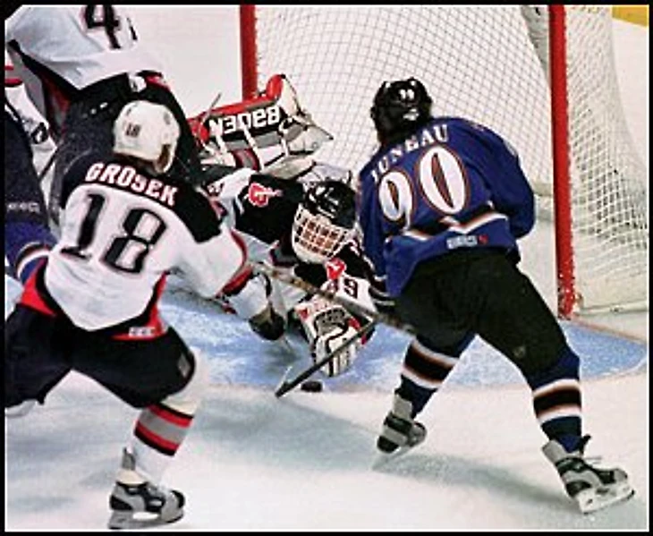 Следующим соперником «Кэпиталз» были хоккеисты «Оттавы». Тогда, без особых проблем «Кэпиталз» прошли «Сенаторз» со счетом 4-1. На фото Марк Тинорди опекает Алексея Яшина.
