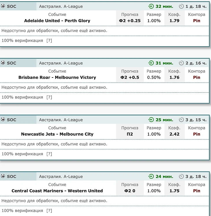 1) Аделаида Юнайтед - Перт Глори. Во-первых, команды уже играли в этом сезоне. В том матче преимущество было на стороне Перта. Это видно и по счету, и было видно по игре. В какой-то момент счет был 5-1 в пользу Перта. Однако прогноз строится не только на этом. Во-вторых, состав Перта будет посильнее. Дальше, в-третьих, Перт проиграл два матча, в каждом из которых вел в счете в какие-то отрезки матча. Стоит также отметить, что Перт догоняет остальные команды А-лиги, тк начал немного позже из-за ковида. Ставка: Ф2 (+0.25) за 1.79 в пинке.