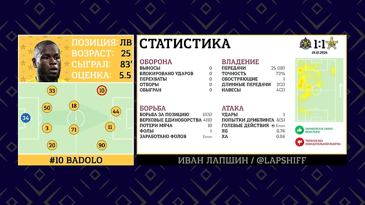 Тем не менее, Ндиага своим усердием (особенно во втором тайме) оставил у меня приятное впечатление. Его вклад в атакующие действия команды был не меньше, чем у Бадоло — отсюда такая же оценка в 5.5 балла.