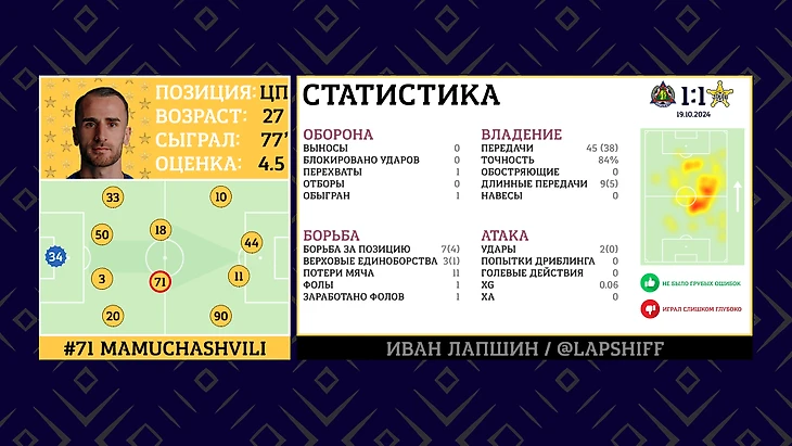Честно говоря, вышло у него так себе. Распасовщику (тем более такому миниатюрному, как Владимер) крайне необходим партнер с умением отбирать мяч рядом, в опорной зоне, и еще один полузащитник чуть выше. В отсутствие последнего, отбирающий мячи Киабу был вынужден смещаться ближе к атаке, из-за чего Мамучашвили оставался фактически один в центре поля при построении атак. Логично, что не видя открытых партнеров рядом, грузин отправлял мяч верхом во всех возможных направлениях. Обострений из этого не вышло, как не вышло и стать рулевым команды в этом матче.