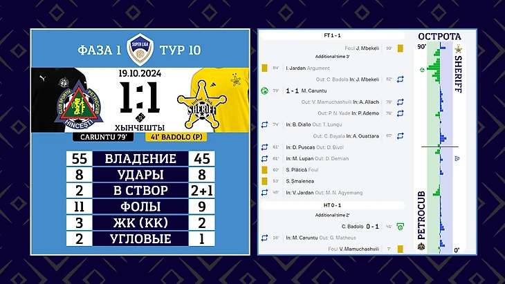 На инфографике, подготовленной автором сего опуса, отражены основные события и ход встречи. В глаза бросается спокойный, несобытийный первый тайм и резкий всплеск атакующей активности во второй половине встречи. Действительно, первые 45 минут матча были скучны до безобразия – «Шериф» вяло контролировал мяч, особо не создав у чужих ворот. Странная расстановка(о нем позднее) вкупе с немотивированными футболистами дала на выходе пресный ногомяч. Так бы с нулями и окончился первый тайм, если бы не свалившийся «Шерифу» с неба подарок в виде пенальти. Буркиниец Седрик Бадоло, главная ударная сила команды весной этого года, уверенно справился с реализацией 11-метрового. На этой положительной для «Шерифа» ноте и закончился первый тайм. Тайм второй поначалу удивил. «Петрокуб» (видимо после разговора в раздевалке) решил с наскока завладеть инициативой и стал зажимать гостей из Тирасполя на их половине поля. Высокая линия обороны команды из Хынчешт сразу же обнажила ее слабые места – быстроногие вингеры «Шерифа» моментально убегали в контратаки (которые, правда, заканчивались там же, где кончалась бровка– кроме спринтов до лицевой футболисты «Шерифа» ничего более не создавали). Однако лавочку быстро прикрыли, и «Шериф» перестал получать возможности для контратак. Игра снова увязла, чтобы приобрести динамику в концовке встречи.