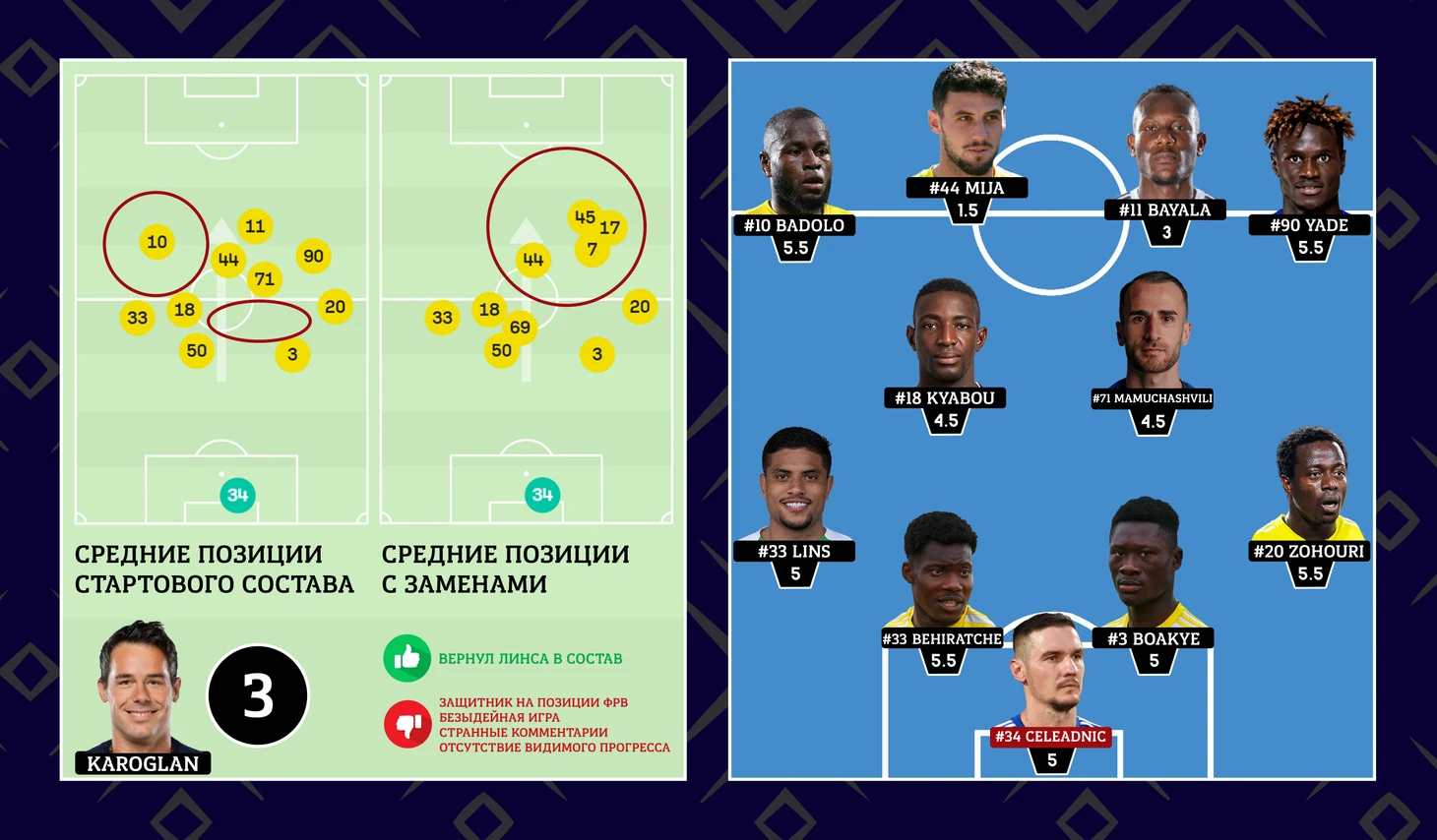 Для чего тогда хорватский тренер Мислав Кароглан выпустил защитника на острие атаки? Очевидно, в расчет бралась результативность Мийи на втором этаже в последних матчах: оборонец забил 2 мяча в 7 матчах. Достаточно ли этого для перевода в атаку? Ответьте на этот вопрос сами, я не хочу материться (с).