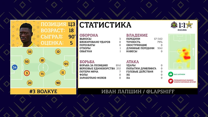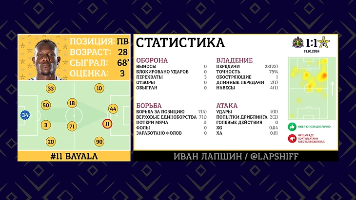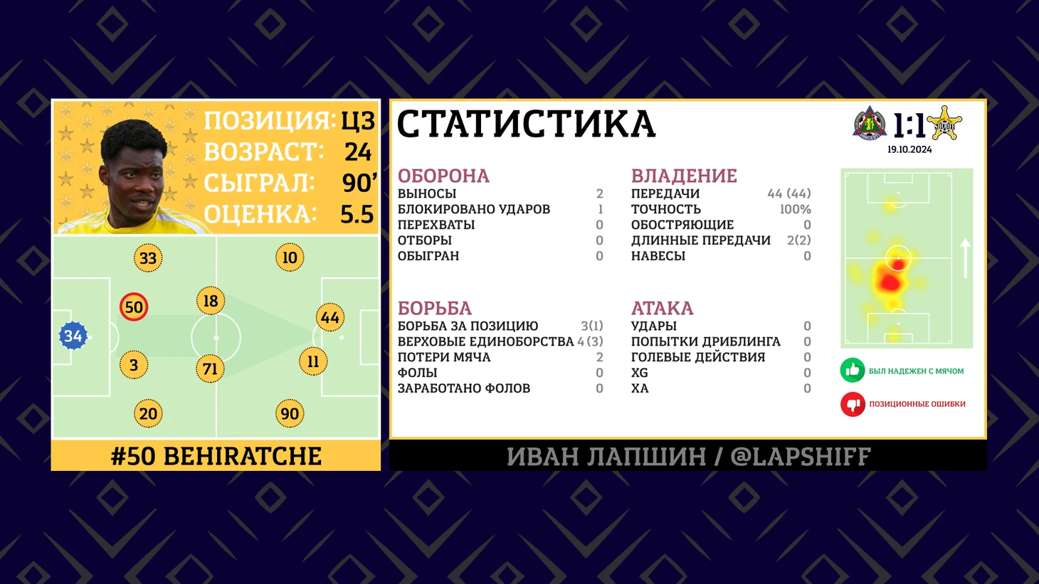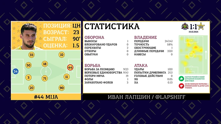 Надежды на доминацию Мийи в воздушном пространстве соперника оказались пустыми. Мийа, как и ожидалось, бездарно провел 90 минут на поле. Атаке не помогал, а напротив, вредил. И обороне, в силу своей позиции на поле, не помогал. Слабенький защитник, оказавшись в качестве форварда, превратился в ходячий манекен. Пушку решили зарядить арбузом. Это была просто катастрофа и полный позор. В такой ситуации оценка 1.5 — настоящий подарок.