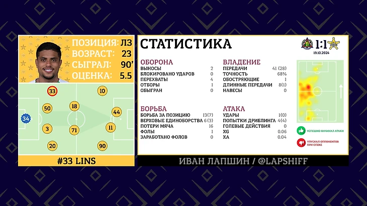 Пара удачных ложных замахов, умная передача под удар и попытки встречать соперника в центре поля — неплохо для первой игры после дисциплинарного наказания. Тем не менее, в защитных действиях были погрешности — Линс дважды за матч упустил Иона Жордана, что могло повлечь последствие в виде гола.