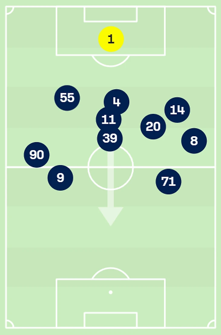 Центрбека на острие атаки. Двух правых вингеров, бегающих в одном месте на протяжении 70 минут. Быть может, в последние 20 минут игры ситуация изменилась? Нет, стало только хуже! Взгляните в левое окошко. Правый график умиляет нас расположением вышедших на замену футболистов — теперь вместо двух вингеров справа оказались три вингера! И это не произвол футболистов, а намеренная установка от тренера. Чего он хотел этим добиться — решительно непонятно.