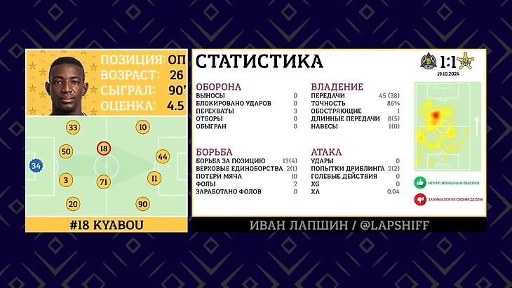 «Малийский Трамп» (так футболист называет сам себя) выдал свой классический перфоманс — неуклюжие движения с мячом, грубые движения без него. Изысков нет, но кто-то ведь должен тащить на себе рояль. Пусть медленно и со скрежетом... В этом матче Киабу располагался непривычно высоко, чуть ли не на позиции левого бокс-ту-бокса. Конечно, мастерства для игры от штрафной до штрафной Мусе не хватает, поэтому в этой игре он был бледной тенью даже себя самого, игравшего глубже. Оценка 4.5 как показатель бессмысленности его пребывания на чужой половине поля.
