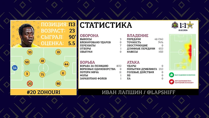 Если Матеус Линс в качестве наказания пропустил лишь несколько игр, то несчастный Армель Зури отсутствовал в заявке «Шерифа» более 200 дней! Вернувшись в конце лета в первую команду, ивуариец застолбил за собой место на правом фланге обороны. Стабильность — его второе имя. Активен и в атаке, и в обороне. Вселяет уверенность в молодого Боакие, но не уживается на «перенаселенном» правом фланге атаки с Байалой и Яде. Нареканий нет никаких, можно только похвалить игрока за преданность делу после месяцев простоя. Тем не менее, и заслуг в этом матче нет, поэтому всего лишь 5.5 баллов.