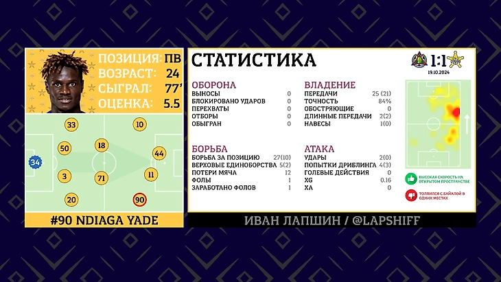 Подписчики моего канала знают, что я очень высоко котирую футболиста сборной Мавритании. Он пришел в «Шериф» летом из «Метца», что уже говорит о футбольной школе, которую он получил во Франции. Быстрый на пространстве, в меру техничный, антропометрически здорово сложенный — прямо дешевый аналог Леау (только левоногий). Ндиага Яде, как и португалец, также выпадает из командного построения во время стерильного владения мячом. Его стихия — контратаки, забегания и спринты.