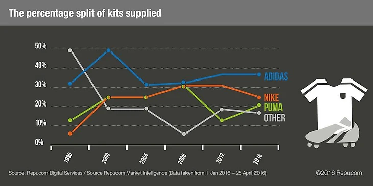 Согласно данным важного агентства спортивных исследований Repucom, еще в 1996 году у Nike было всего около 7% рынка футбольных форм. У Puma – 10%, у adidas – 31%. Остальное принадлежало другим брендам – Kappa, Umbro, Fila, Admiral, Hummel.
