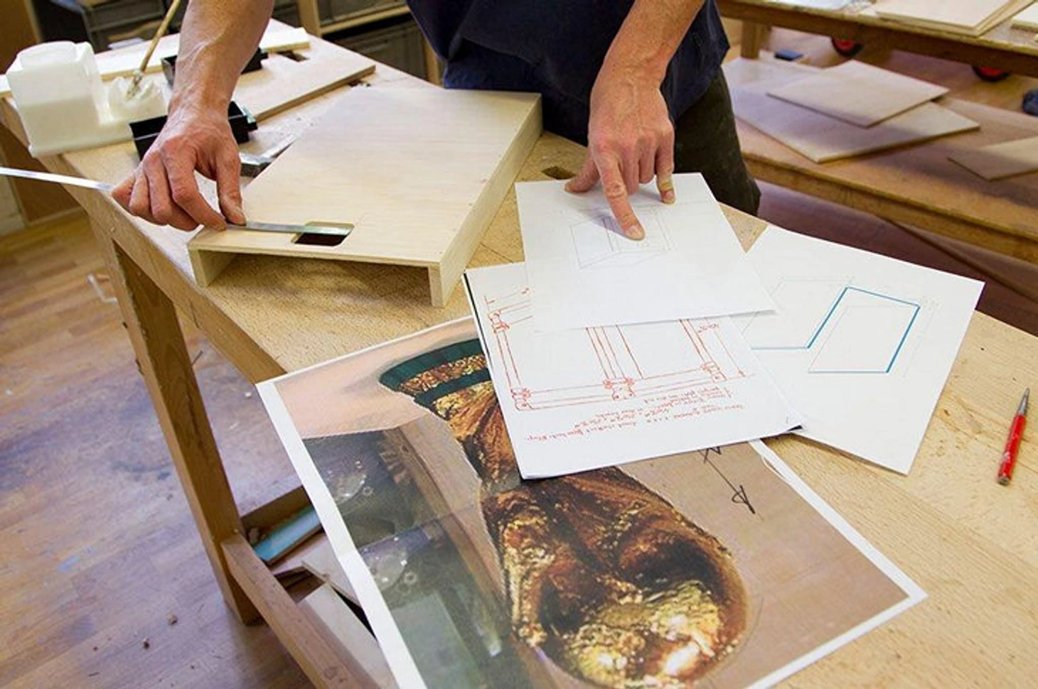 Футляр создавался в исторической мастерской в Аньере, недалеко от Парижа, где LV ежегодно выполняет 450 специальных заказов. Кейс выполнен из холста и кожи с монограммами Louis Vuitton, снабжен латунными замками и огранен отполированными до блеска углами.
