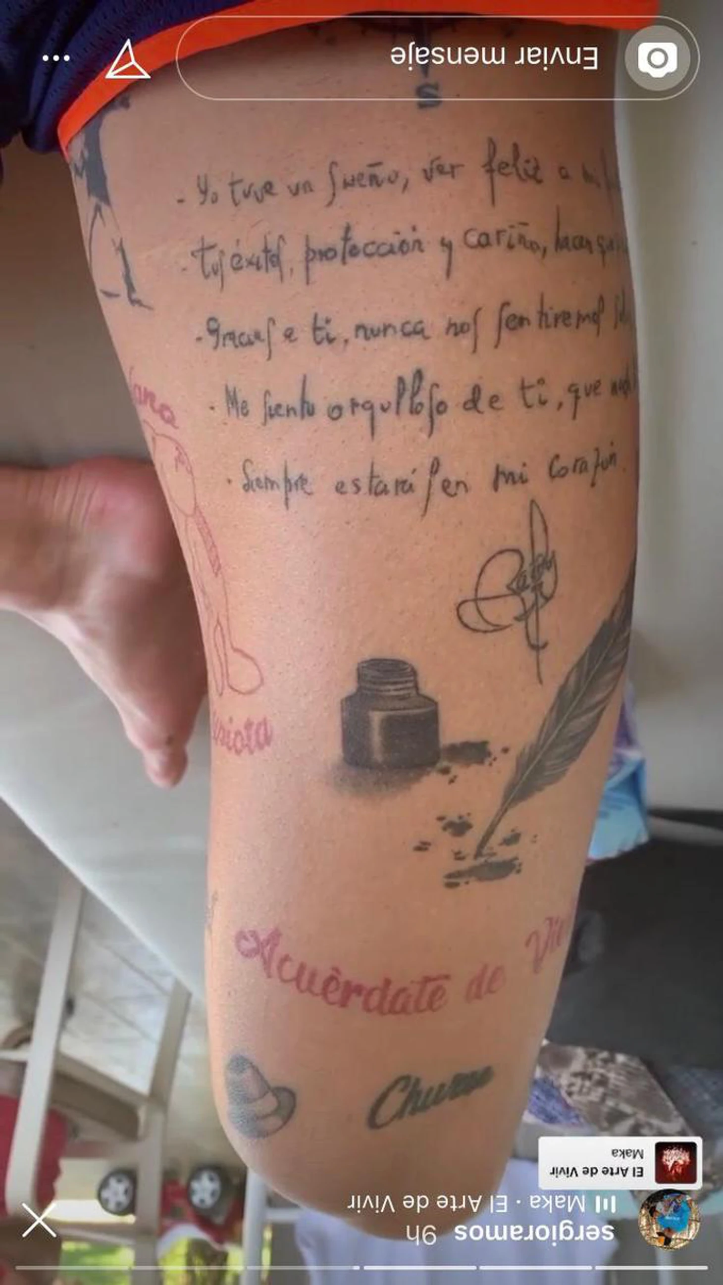 На левом бедре у Рамоса татуировка с письмом его отца, Хосе Марии. «Я горжусь тобой. Ты всегда будешь в моем сердце», – так заканчивается письмо. Ниже – перо, чернильница и подпись отца.