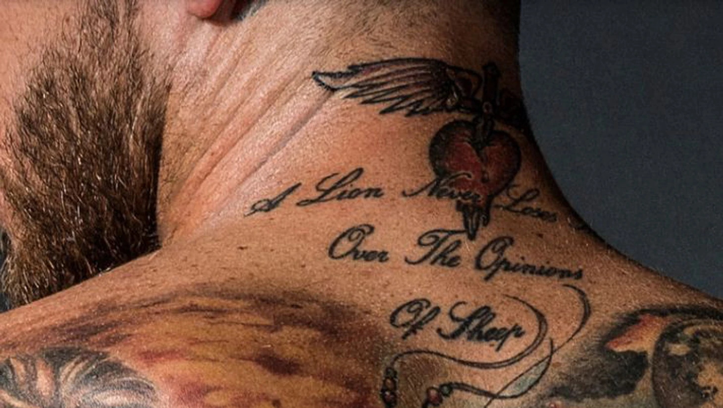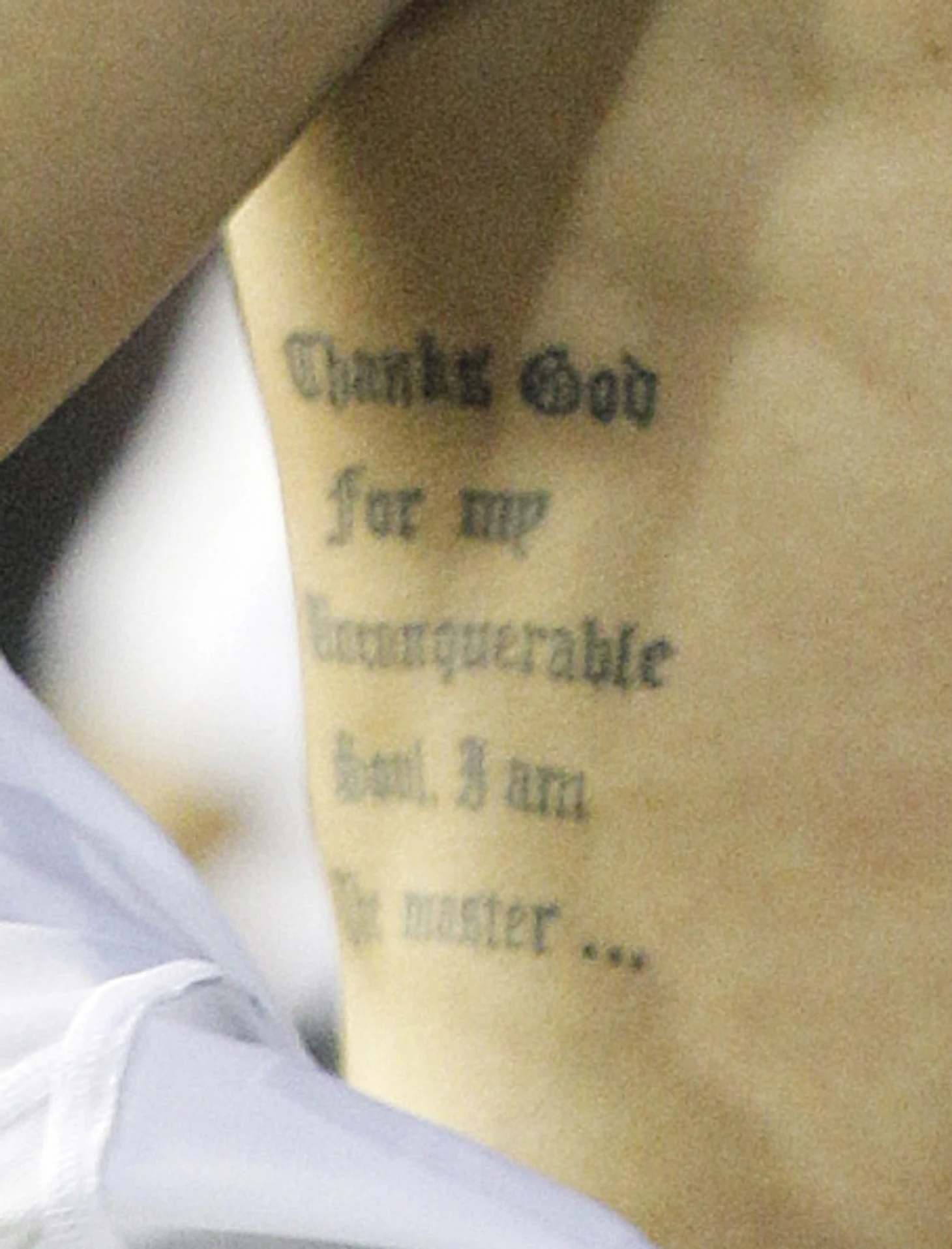 Справа на ребрах защитник зафиксировал слова из фильма «Непокоренный» про Нельсона Манделу: «Спасибо Господу за мой непобедимый дух. Я хозяин [своей судьбы]». Это строки из стихотворения Уильяма Хенли. Мандела говорил, что во время 27-летнего заключения это стихотворение вдохновляло его.