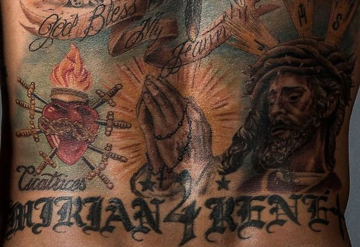 На спине серия библейских мотивов. Справа изображен Иисус Христос, который сложил руки в молитве, на них – четки с крестом и звездами в виде подвесок. Слева татуировка сердца с пламенем, пронзенным 8 кинжалами. Ниже есть надпись Cicatrices («Шрамы»). Сердце – это символ Непорочного Сердца Марии, которое вместе со словом Cicatrices символизирует шрамы от заживших ран.