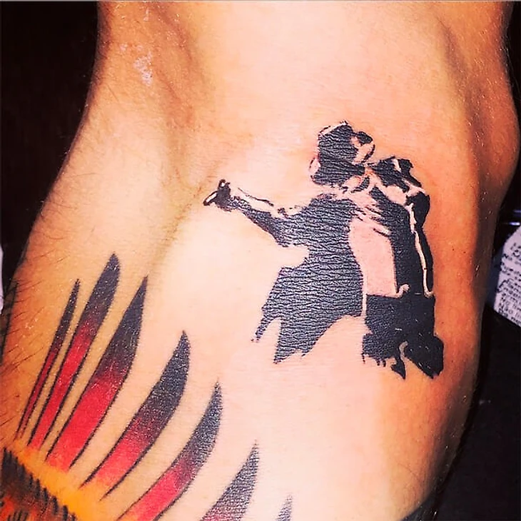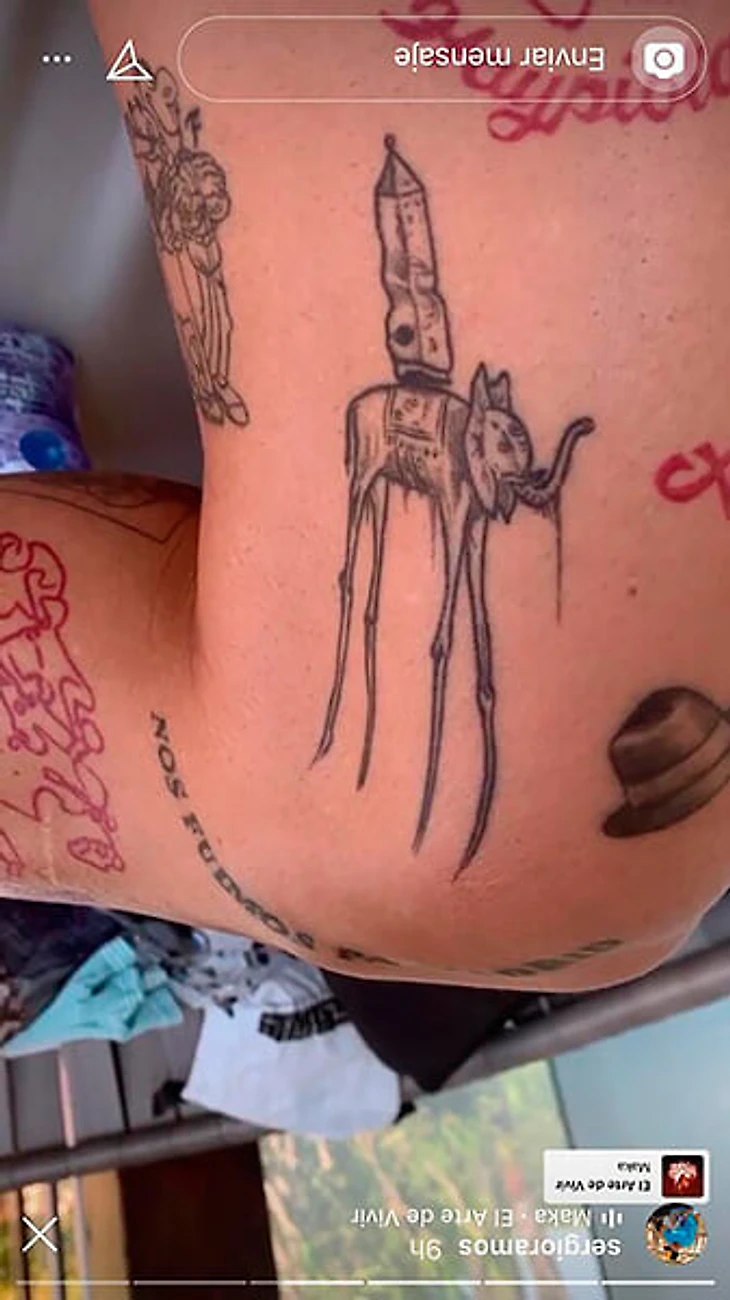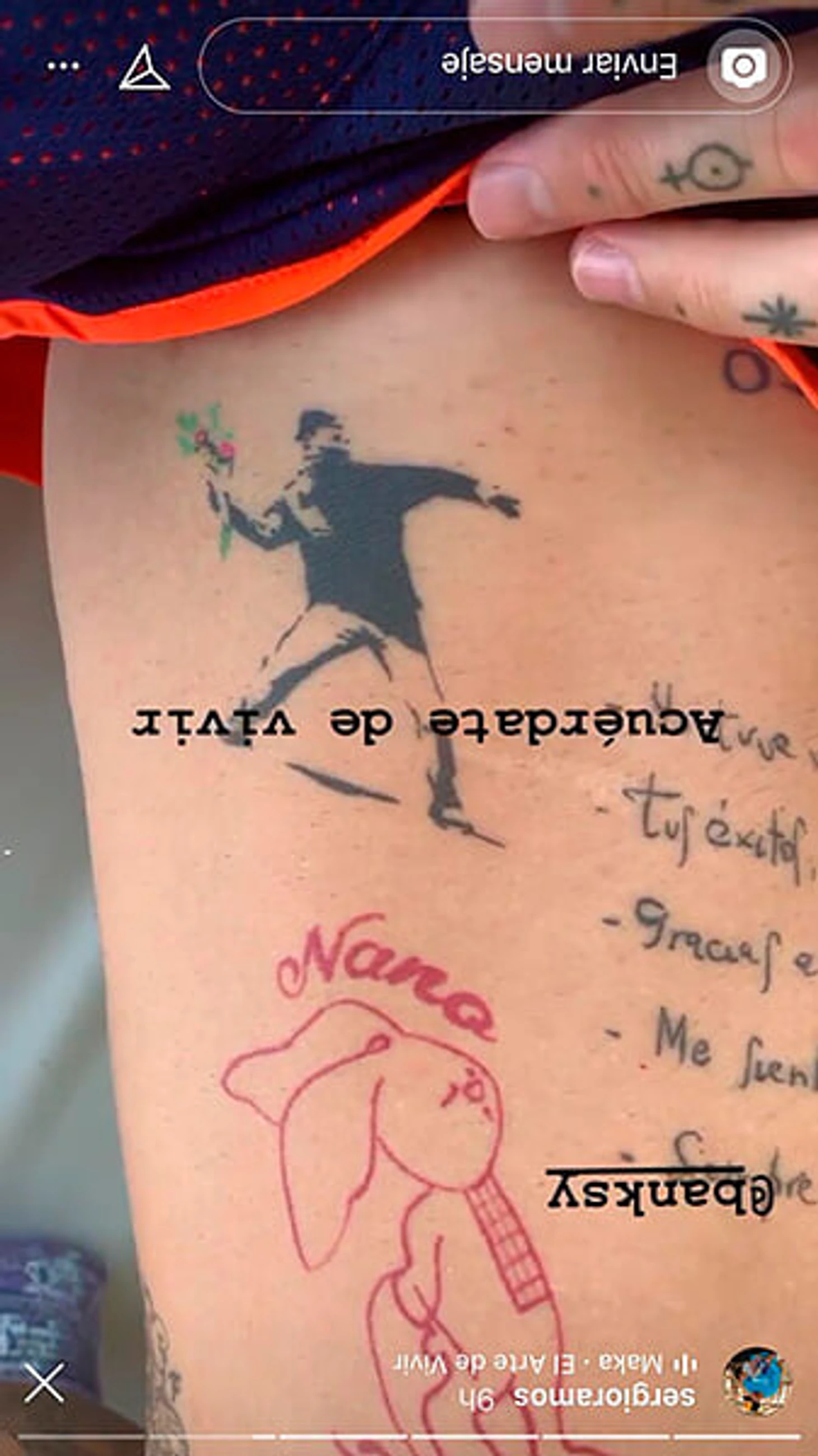 С годами испанец полюбил искусство и, похоже, набил на левом бедре любимые произведения: граффити легенды стрит-арта Бэнкси, где протестующий в маске бросает не «коктейль Молотова», а букет цветов. Кстати, у Серхио в коллекции есть картина Бэнкси «Клубничный пончик», она обошлась ему в 50 000 евро. На той же ноге изображен слон из картины Сальвадора Дали «Слоны».