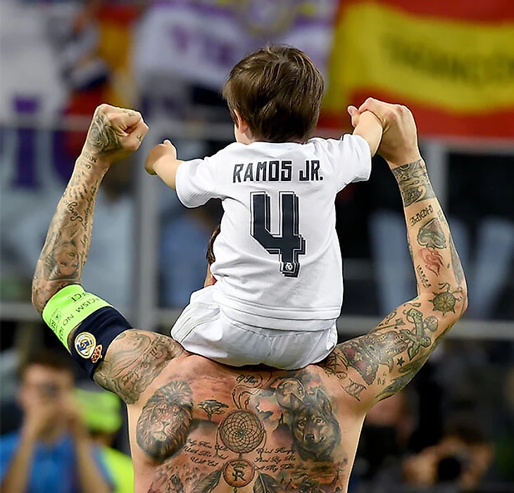 Тату и правда важная часть образа Рамоса. У испанца более 40 татуировок (он сам не помнит их точное количество) преимущественно с отсылками к семье и футболу. Одну из последних Серхио посвятил свадьбе, набив единорога с тремя звездами как символ единения с женой. Звезды – трое детей Рамоса: Серхио-младший, Марко и Алехандро.