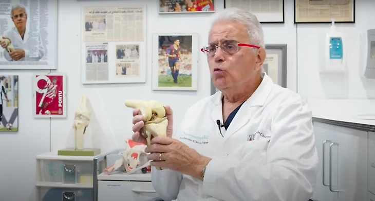 Кугат несколько раз появляется в кадре с макетом коленного сустава и с энтузиазмом рассказывает об операции. «Связку не так уж и сложно оперировать», – объясняет он. Сначала делают анестезию (лекарство вводят в эпидуральное пространство позвоночника через катетер), берут трансплантат из собственной связки надколенника, просверливают отверстия в бедренной и большеберцовой кости, куда и устанавливают трансплантат.