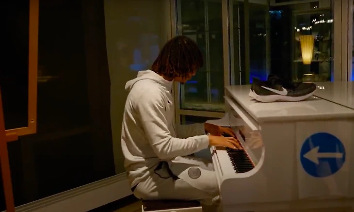 В отеле после матча все расслаблены и в хорошем настроении. Натан Аке красиво играет на пианино мелодию Nuvole Bianche, в какой-то момент сбивается, но ему все равно бурно аплодируют. Вместо нот перед ним лежат кроссовки.