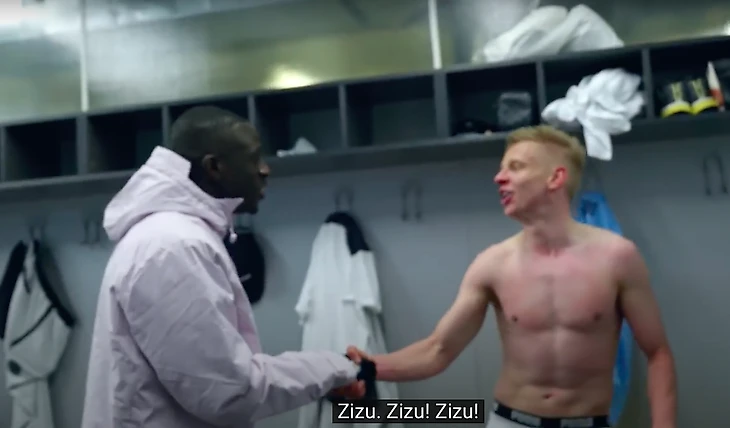 Зато камеры засняли, что происходило в раздевалке после матча с «Дортмундом». Довольный Пеп обнялся с помощником, Зинченко прокричал «Вамос» в камеру и рассказал, что опять получил в зуб в матче. Тут же к Саше подошел Менди и назвал его «Зизу».