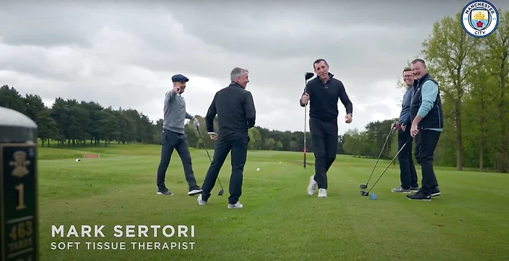 Ну и, наконец, мы узнаем, что у «Манчестер Сити» есть день, когда Пеп и сотрудники играют в гольф. Например, в игре участвует Марк Сертори, специализирующийся на восстановлении мышц. На заднем плане энергичный Пеп в кепке.