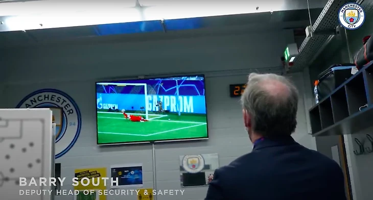 • Заместитель начальника службы безопасности «Манчестер Сити» Барри Саут наблюдает в раздевалке по телевизору за матчем с «Боруссией».