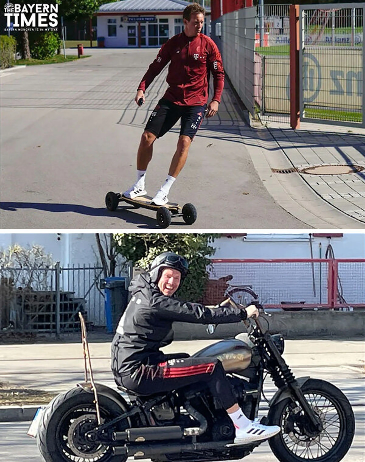 В «Лейпциге» молодой тренер часто добирался на работу на скейтборде. И с этим не было никаких проблем (возможно, на это даже не обращали внимания). Но как только Юлиан приехал на скейте на тренировку «Баварии», фотка тут же везде разлетелась. Как-то Нагельсманн зашел дальше и пригнал на базу на мотоцикле Harley-Davidson.