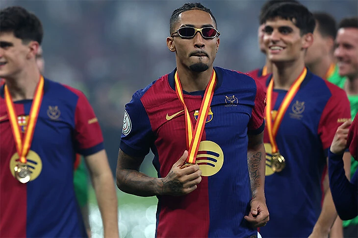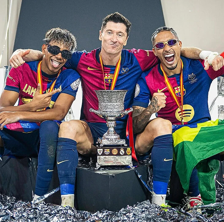 «Барса» утащила Суперкубок Испании. А главным кадром с празднования стала фотография Ламина Ямаля, Роберта Левандовского и Рафиньи с трофеем (более 3,8 млн лайков). Испанец и бразилец уселись по бокам в солнцезащитных очках от Gucci и Oakley. Хотя в Джидде солнце уже спряталось.