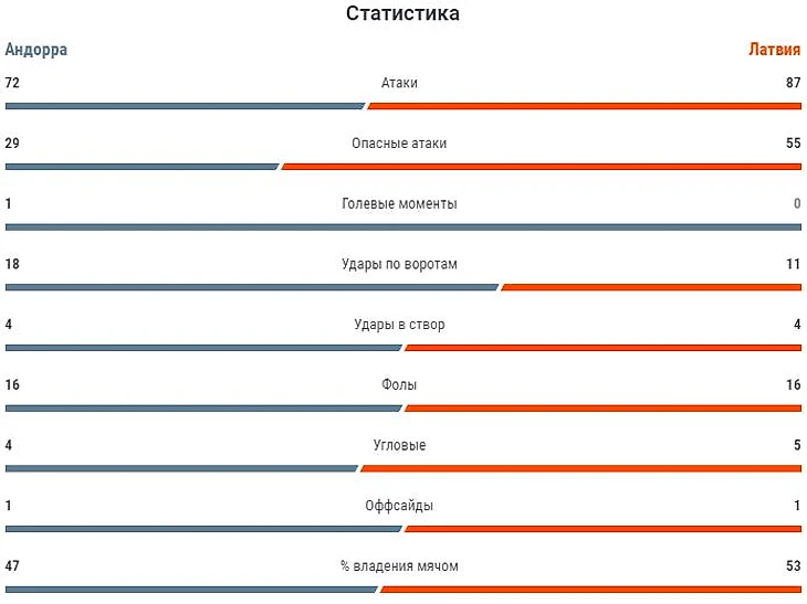 Подопечные Дайниса Казакевича в первом тайме ответили ударом головой в исполнении Яниса Икауниекса, который без труда зафиксировал голкипер сборной Андорры. Мог отличиться и Владислав Гутковскис, но нападающий чуть-чуть не попал в створ.