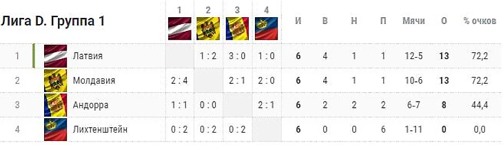 На 50-й минуте чудовищную ошибку у собственных ворот допустили андоррцы. Раймонд Кроллис обокрал защитника и отдал передачу на Владислава Гутковскиса, который в упор расстрелял ворота Икера Альвареса. Для нападающего польского "Ракува" этот гол стал 11-м в футболке национальной сборной. Вскоре после этого в составе сборной Андорры на поле появился Альберт Росас, который на протяжении всего второго тайма трепал нервы защитникам сборной Латвии и вратарю Павлу Штейнбору. 20-летний нападающий "Андорры" как минимум трижды мог сравнять счёт - сначала он обокрал Савалниекса и пробил в упор, но выручил Штейнбор. Еще несколько минут спустя Росас пробил издали в дальний угол ворот Штейнбора, но чуть-чуть не попал. На 88-й минуте Росас всё-таки добился своего и сравнял счёт. Элвис Стуглис отдал передачу назад Штейнбору, который завозился с мячом. Росас его обокрал и поразил пустые ворота. В оставшееся время сборная Латвии никуда не спешила, ведь этот счёт их устраивал для того, чтобы завоевать путёвку в лигу "С" следующего розыгрыша Лиги наций. В параллельном матче Молдова обыграла Лихтенштейн со счётом 2:0, забив оба мяча в компенсированное время. Таким образом, после шести туров сборные Латвии и Молдовы набрали одинаковое количество очков (13), но за счёт лучшей разницы забитых и пропущенных мячей подопечные Казакевича заняли первое место в группе. Андорра: Alvaress - Pomaress, Alavedra (Bernats 74'), Jovera, de Pabloss - Servoss, Valess, Revess (Pujols 87'), Ruvio (Martiness 54') – Fernandess (Rosass 54'), Vjeira (Blanko 74') Латвия: Šteinbors - Jurkovskis, Stuglis, Dubra, Savaļnieks – Cigaņiks (D. Ikaunieks 85'), Emsis (Tarasovs 82'), Tobers, J. Ikaunieks - Gutkovskis, Krollis Источник: sportacentrs.com, rus.tvnet.lv, championat.com, lff.lv