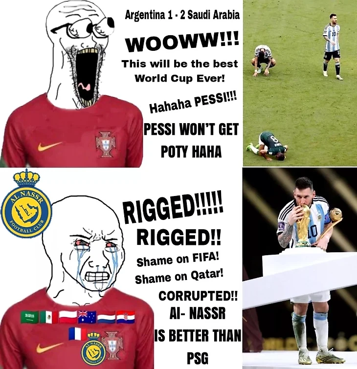 Как поживает обожаемый многими Cristiano Ronaldo(читаем с пафосно и напыщенно)? А вот так себе у него дела: вылет в 1/2 Суперкубка, вылет из 1/2 кубка и 2 место в чемпионате(отстают на 3 очка+матч в запасе у Иттихада). Чёт не клеится совсем, сейчас бы взять игрока на 200 лямов в год и слить все титулы. Рон тоже выдаёт, то агрессивно ручками махать начнёт, то сопернику болевой проведёт, то тренера уволит. Да, позвали звезду, Мартинез, Талиска, Игало и Густаво даже рядом не стоят с величием Криша, но надо понимать, что карета превратилась в тыкву: от топ-10 лучших игроков и статуса «затащить в соло для меня не проблема» до человека, рушащего своим поведением и действиями экосистему, тактику, надежды и финансы клуба, в котором играет. Но с точки зрения маркетинга вышло просто супер - миллионы подписчиков, хайп, новые рекламные контракты, вроде как должны отбить 200 лямов, вбуханных на з/п КриРо