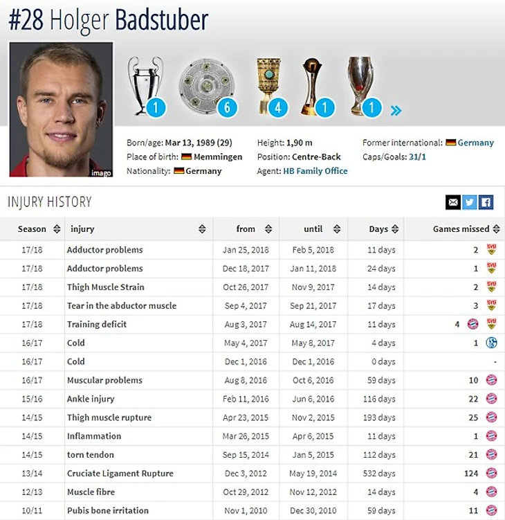 Вчера я неосторожно высказался о том, что Бадштубер – это must have. Меня одернули, я задумался и стал изучать историю болезни. Оказалось, тут есть все: от простуды до травм, в принципе ведущих к инвалидности. Тем удивительнее, что Хольгер до сих пор в строю и даже на приличном уровне.