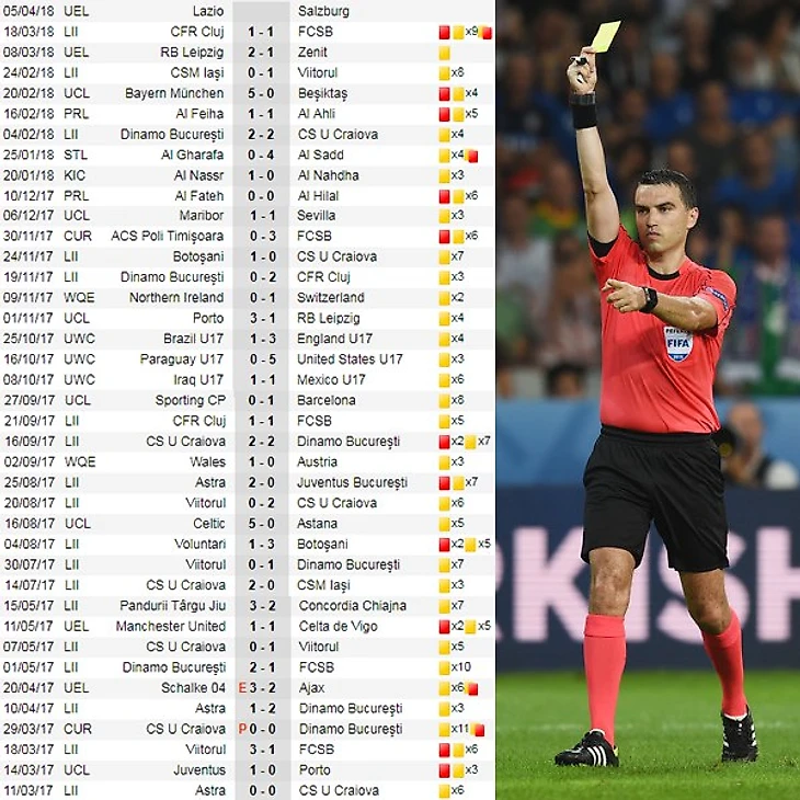 Вот раскладка за год. В таблицу у меня вошли 38 матчей самого разного уровня, где отработал Хацеган. 200 желтых и 14 прямых красных. Destul spus!