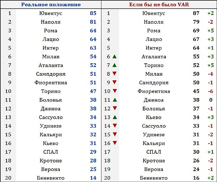 Без VAR «Рома» набрала бы на 5 очков больше, «Интер» – на одно. «Милан» имел бы на четыре очка меньше, чем в реальности, «Фиорентина» – на целых шесть. И есть только одна команда в чемпионате, на количество очков которой система не повлияла никак – это «Дженоа». А перестановки в турнирной таблице коснулись бы только ее середины, никак не затронув позиции лидеров и аутсайдеров.