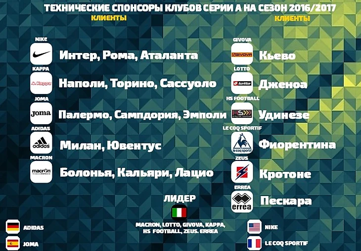 Самые популярные технические спонсоры клубов Серии А 2016/2017.